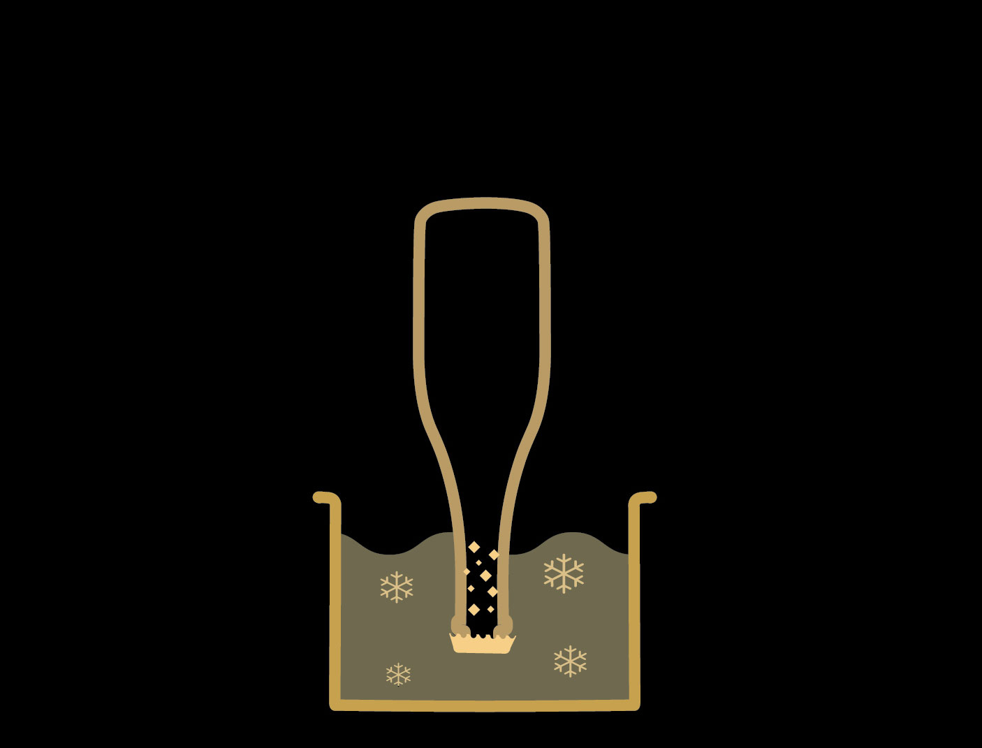 Aus der Flasche entfernt wird das Hefedepot, das sich im Flaschenhals abgesetzt hat, mit Hilfe des »kalten« Degorgierverfahrens (Dégorgement à la glace) – die epochale Erfindung des Sohns eines Mitte des 19. Jahrhunderts in die Champagne ausgewanderten Schwaben. Bei diesem Verfahren werden die Flaschen kopfüber in eine minus 20° Celsius kalte Salzlösung getaucht. Dadurch bildet sich ein Eispfropfen mit dem eingefrorenen Hefedepot. Da der Propfen am vereisten Flaschenhals haften bleibt, rutscht er nicht in die Flasche zurück, wenn sie zum Öffnen umgedreht wird.